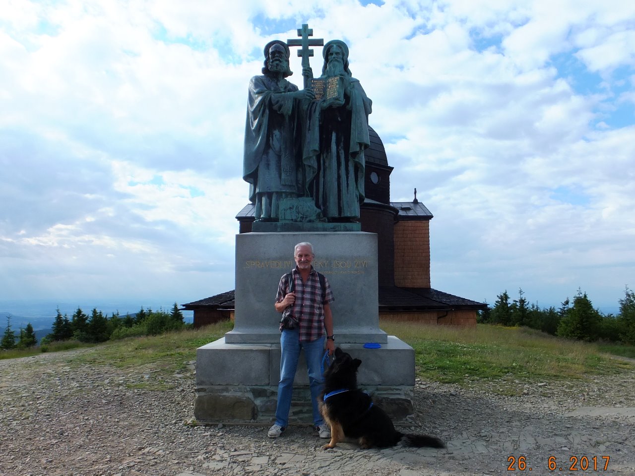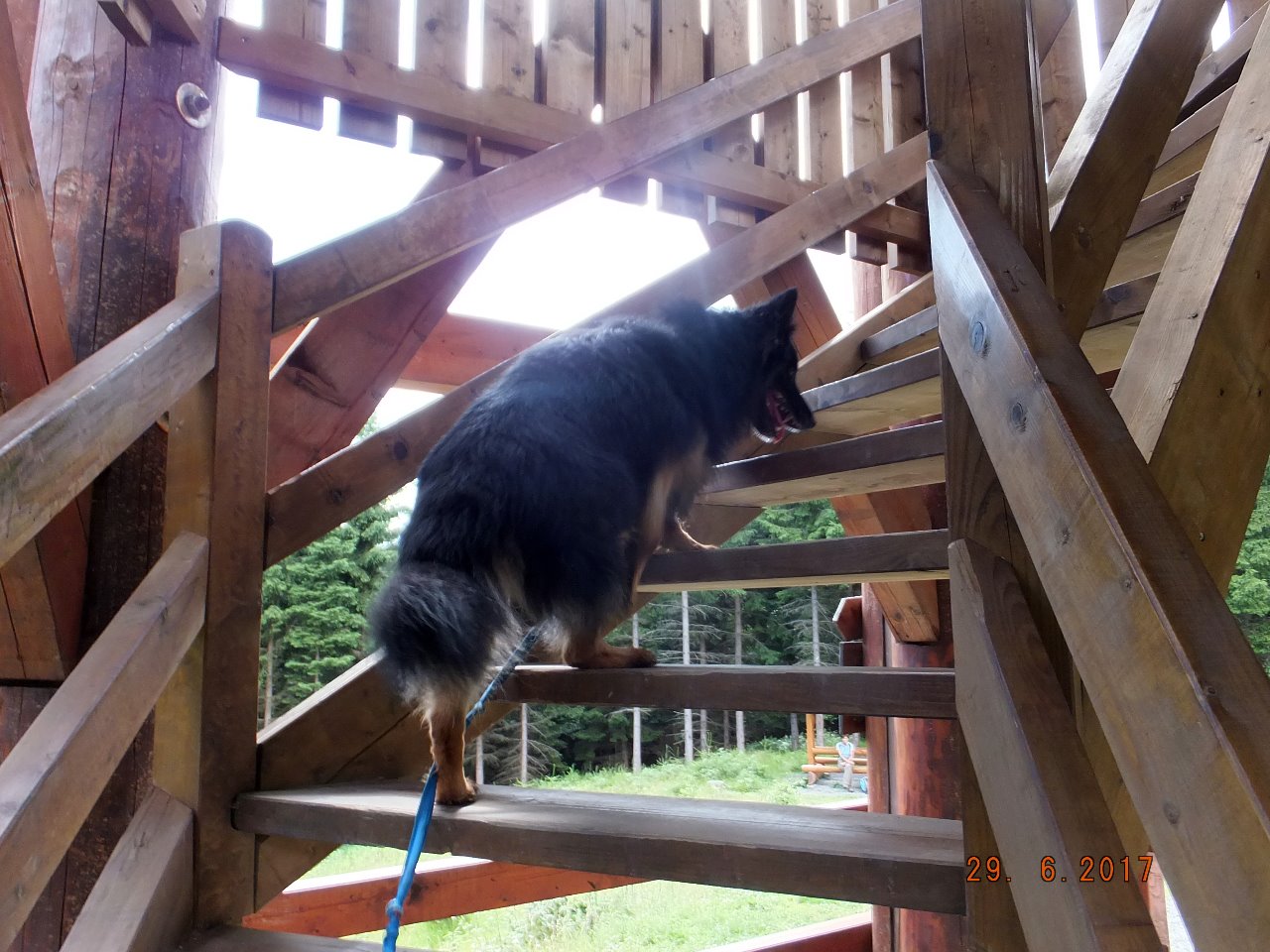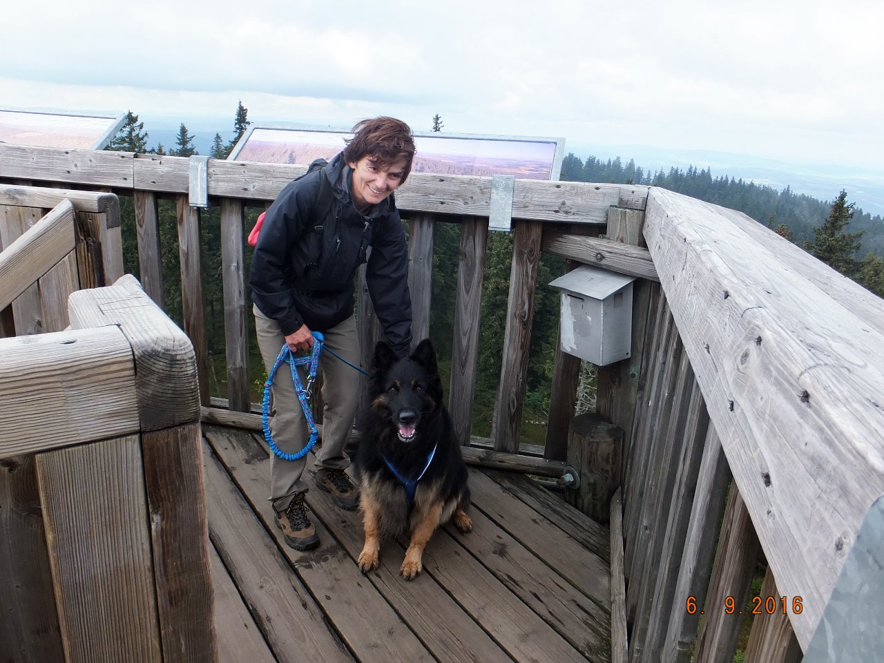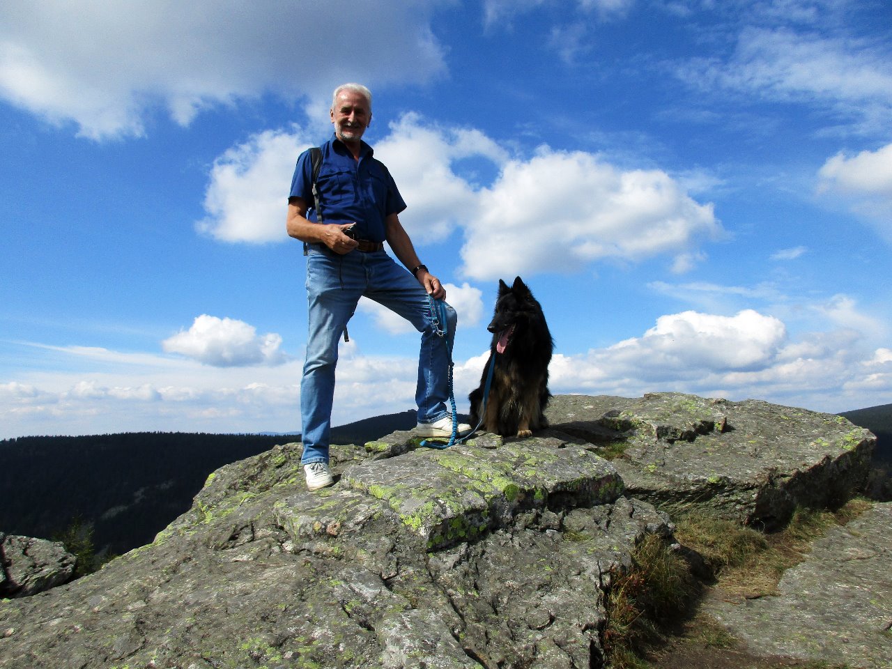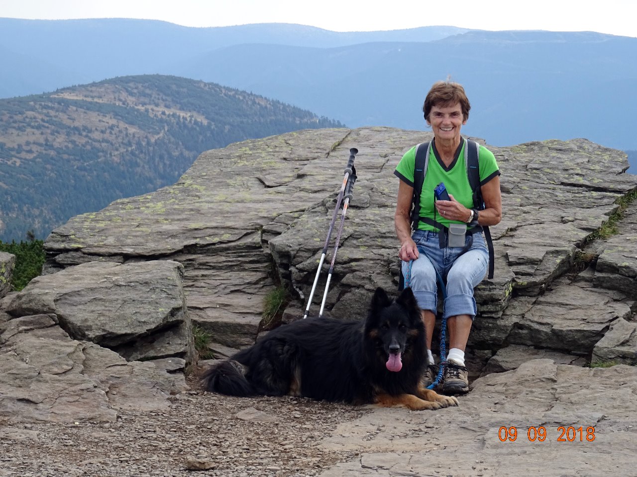 Já jsem totiž od začátku května 2015 začal děsit Milana (i několik zvířecích lékařů) nezvyklými zdravotními potížemi, kvůli kterým jsme museli poněkud změnit režim a vzdát se i jičínského cvičáku. Zakusil jsem si svoje, nejsem ovšem žádná bábovka a i když to trvalo s přestávkami přes rok, s Milanovou pomocí jsem vše zvládl. A tak jsme za ty poslední 4 roky prochodili Beskydy, Jeseníky, Šumavu, Krušné hory, Jizerky i Krkonoše, zavítali jsme do Orlických hor i Žďárských vrchů. Vylezli jsme na spoustu horských vrcholů a stal se ze mne možná nejlepší psí "rozhlednolezec" v České republice :-)).