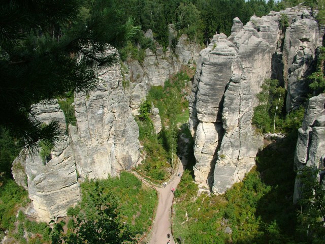 Tak jsme si dnes (ve čtvrtek) vyšlápli do Prachovských skal. Milan se bláhově domníval, že tam snad ve všední den nebude až tolik lidí, ale už první pohled na přeplněná parkoviště ho opravdu, ale opravdu zklamal. Rodiny, zájezdy, páry, pejskaři, různorodé skupiny Čechů, Poláků, Britů, Němců, nevychovaných Holanďanů atd. – no, Václavák. Prvně v životě jsme před jednou z delších soutěsek museli čekat, až sejde dolů asi 40členná skupina (a že to někteří vzhledem k svým proporcím brali po zadku :-)).